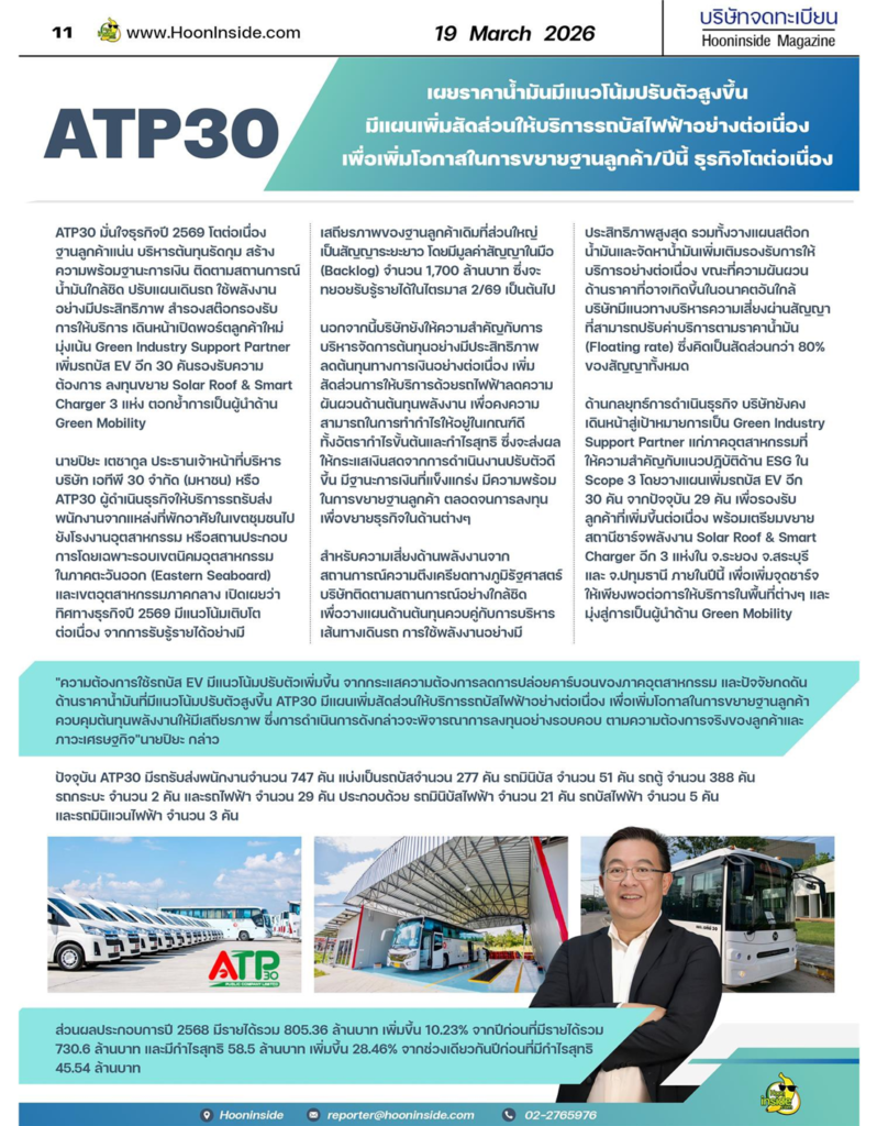 View Larger Image ATP30: ยุทธศาสตร์ รถไฟฟ้า สู่ Green Mobility By ann|2026-03-20T14:47:52+07:00March 20, 2026|General, ข่าวและความเคลื่อนไหว, นักลงทุนสัมพันธ์, ประชาสัมพันธ์|0 Comments Share This Story, Choose Your Platform! FacebookTwitterRedditLinkedInWhatsAppTumblrPinterestVkXingEmail About the Author: ann Related Posts ATP30 เดินหน้าเพิ่มบัส EV – ลงทุนสถานีชาร์จ Gallery ATP30 เดินหน้าเพิ่มบัส EV – ลงทุนสถานีชาร์จ ATP30 วางหมากสู้ดีเซล โดดรับเมกะเทรนด์อีวี Gallery ATP30 วางหมากสู้ดีเซล โดดรับเมกะเทรนด์อีวี ATP30 หุ้นไฮโกรทซ่อนค่า ปั้นกำไร 3 ปี 150 ล้าน Gallery ATP30 หุ้นไฮโกรทซ่อนค่า ปั้นกำไร 3 ปี 150 ล้าน ATP30 โตทุบสถิติ ปี 68 กวาดรายได้ 805.36 ลบ. กำไรพุ่ง 28.46% เล็งเคาะปันผล 0.04 บาท/หุ้น Gallery ATP30 โตทุบสถิติ ปี 68 กวาดรายได้ 805.36 ลบ. กำไรพุ่ง 28.46% เล็งเคาะปันผล 0.04 บาท/หุ้น Leave A Comment Cancel replyComment Save my name, email, and website in this browser for the next time I comment.
